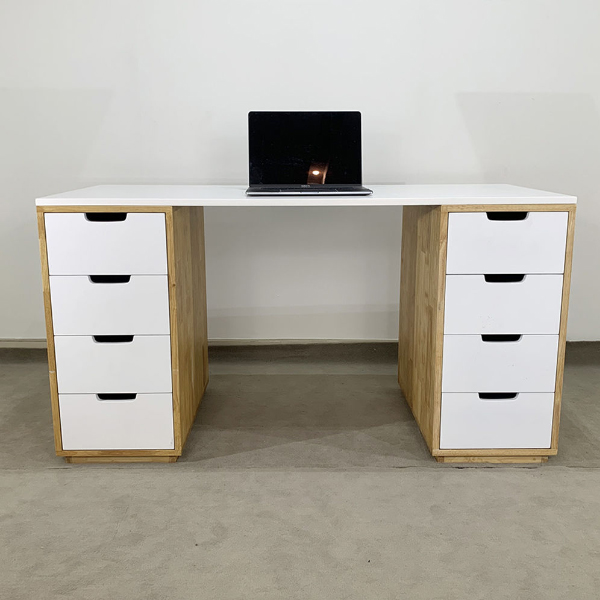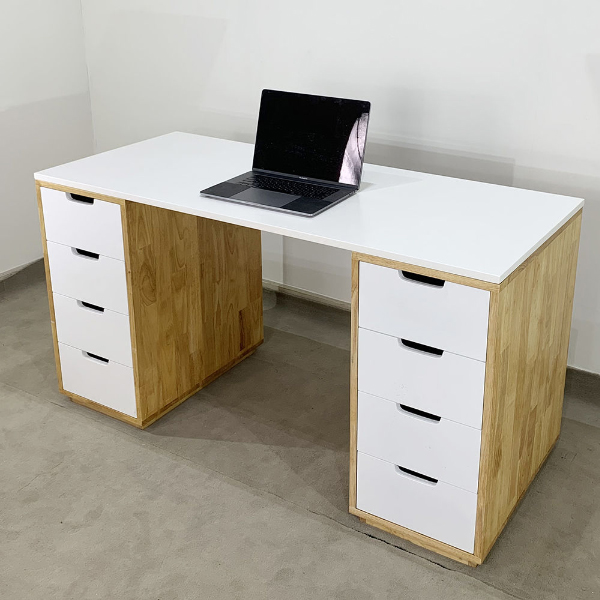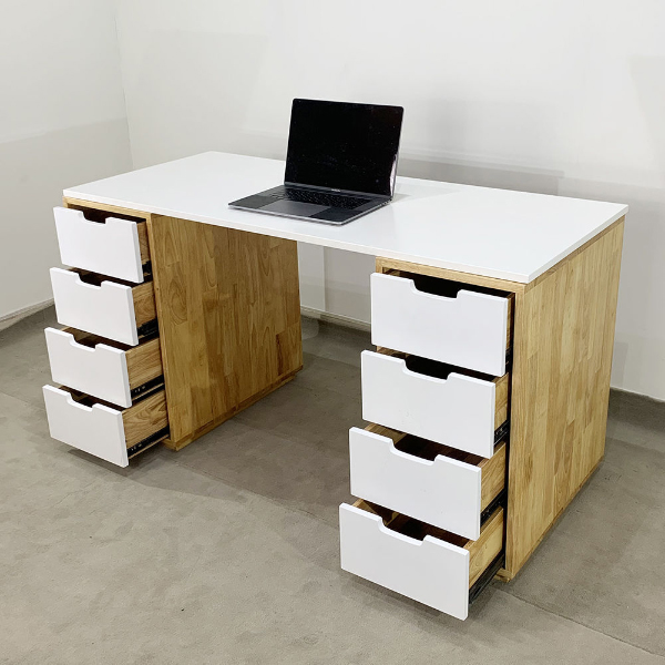 - Bàn học hai chân trụ gỗ cao su màu trắng sang trọng với 2 chân là hệ tủ hộc kéo 4 ngăn cao 73cm rất tiện lợi vói chiều ngang tủ 35cm