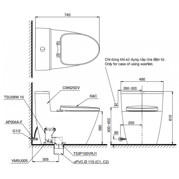 Bàn cầu 1 khối kèm nắp rửa điện tử WASHLET dòng S7 TCF4911Z, bích nối sàn và van dừng. (Giá đã bao gồm VAT)