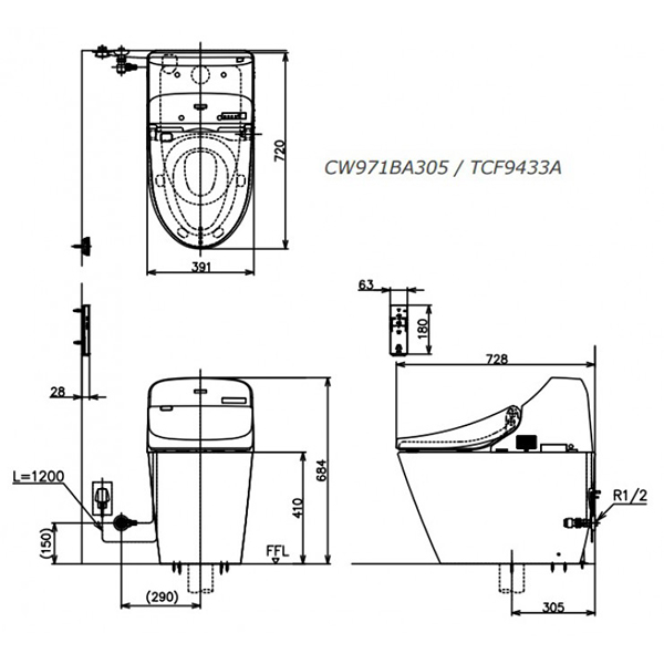 Bộ sản phẩm bao gồm 1 bồn cầu điện tử loại GG C971, 1 nắp rửa điện tử WASHLET TCF9433A (220V), bích nối sàn và van dừng. (Giá đã bao gồm VAT)