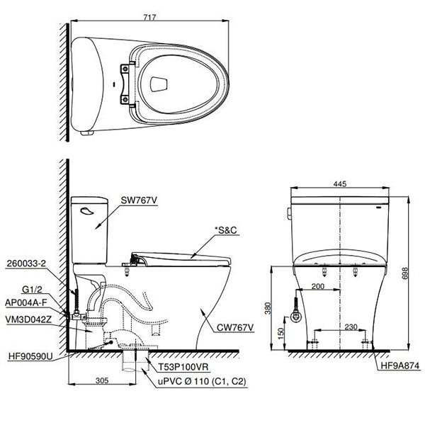 Bồn cầu hai khối kèm nắp rửa điện tử WASHLET dòng C5 (giấu dây), bích nối sàn, van dừng. (Giá đã bao gồm VAT)