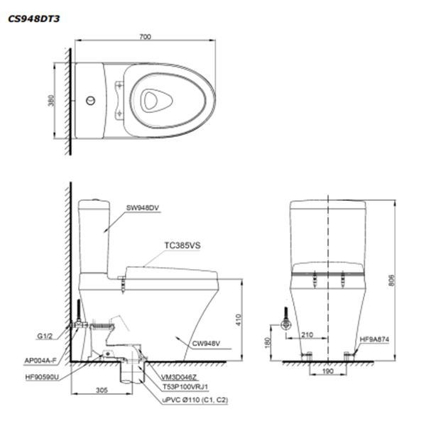 Bồn cầu hai khối kèm nắp đóng êm TC385VS, bích nối sàn, van dừng. (Giá đã bao gồm VAT)