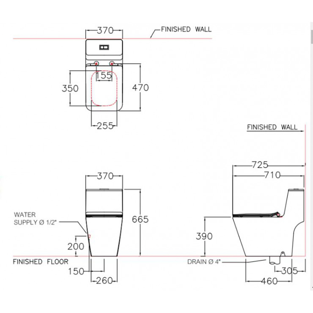 - Thiết kế: Thân vuông dài, thoát thẳng, tâm xả 305mm.