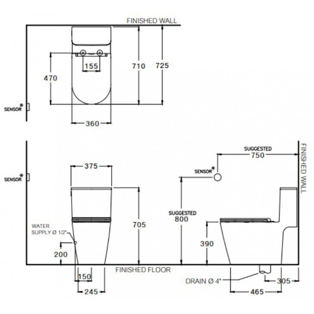 - Bồn cầu một khối xả không chạm, nắp đóng êm (Thân dài).