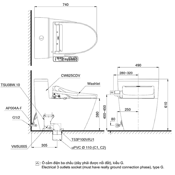 Bồn cầu một khối kèm nắp rửa điện tử WASHLET dòng C5 TCF24460AAA, bích nối sàn, van dừng. (Giá đã bao gồm VAT)