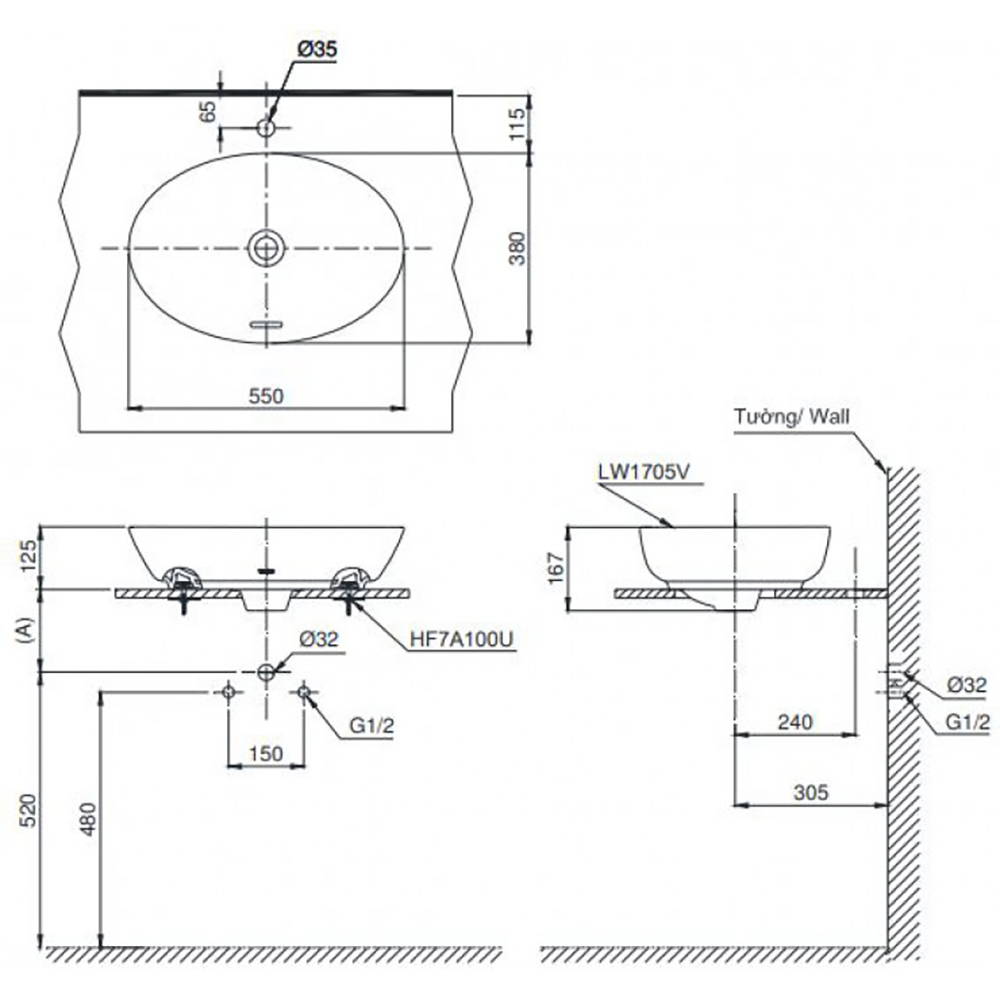 | Kích Thước Trên Chậu | L380mm | W550mm | H167mm |