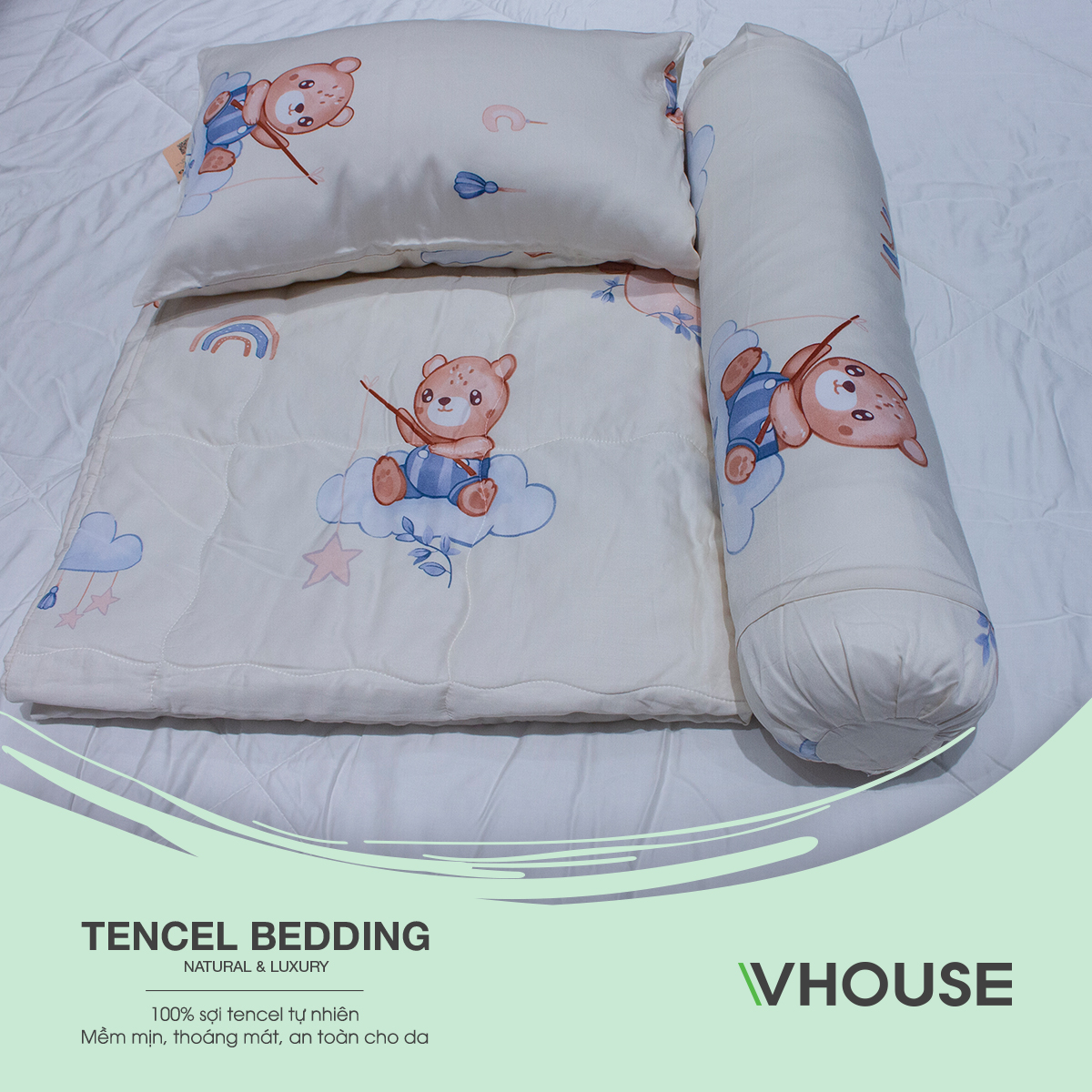 Vỏ gối nằm được làm từ 100% Tencel êm mềm mát mịn cho bé, nhiều họa tiết dễ thương.
