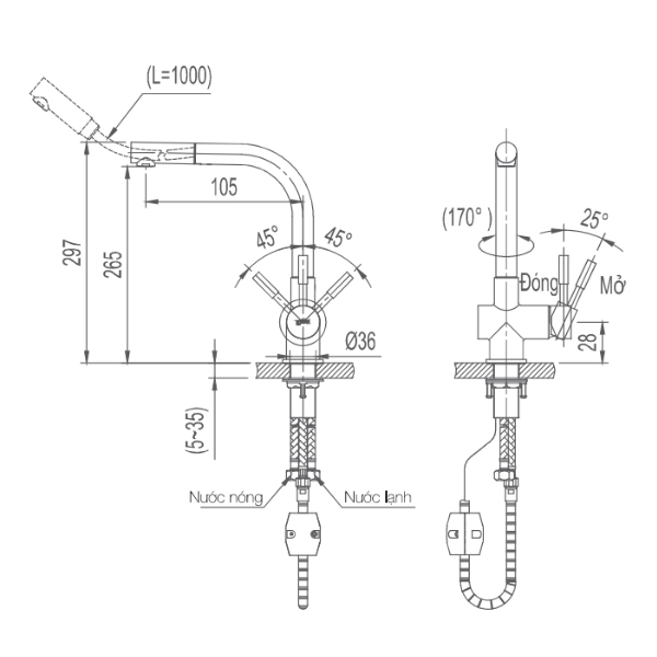Vòi bếp đa năng. Đầu vòi có thể kéo ra được. Áp lực nước cấp 0.1MPa ÷ 0.5MPa
