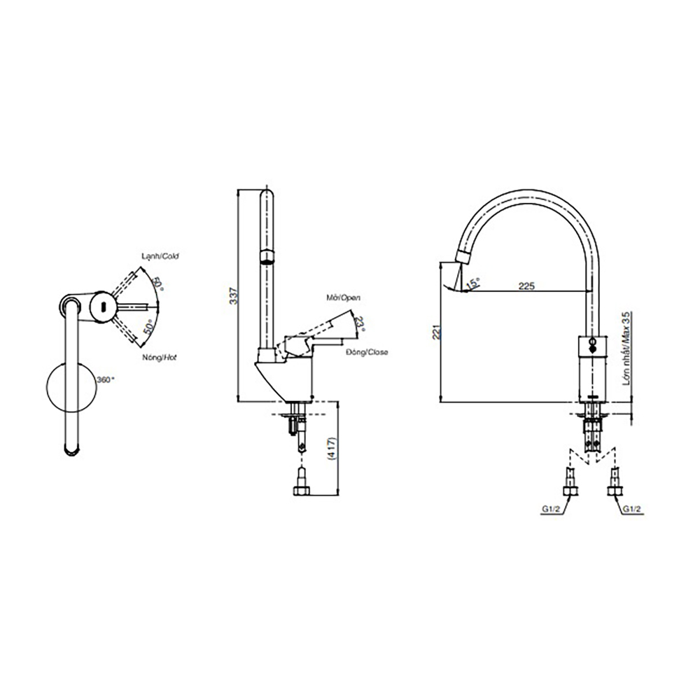 - Vòi rửa chén có thể xoay: 180 độ